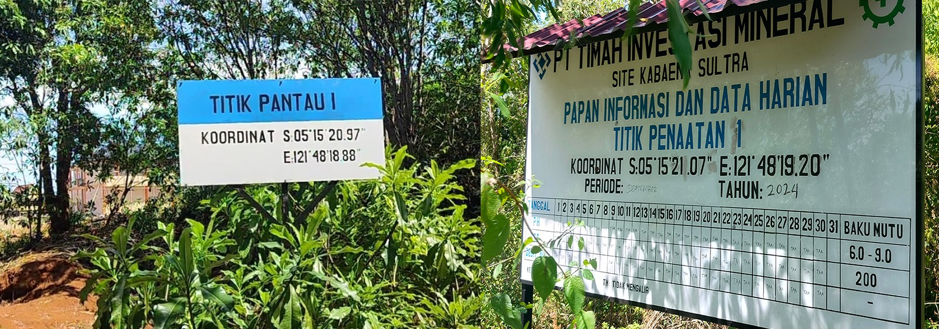 Saat didekati, plang tersebut bertuliskan milik PT Timah Investasi Mineral (PT TIM), dengan keterangan “Titik Pantau I” lengkap dengan koordinat geografis.