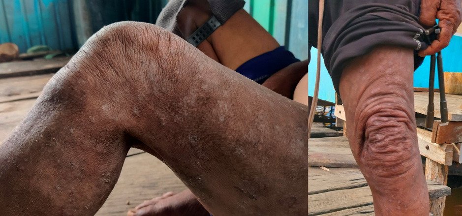 “Ini… dari lutut, bokong sampe di bawah e. Jangan mi sa buka semua toh,” katanya malu-malu. “Terlalu parah.” Bukan hanya dia. Istrinya juga terkena gatal-gatal.