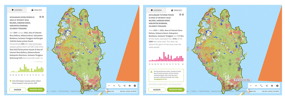 Sedangkan dalam kurun waktu satu setengah tahun terakhir, periode April 2024 sampai Oktober 2025, ada 33.769 titik koordinat sinyal peringatan deforestasi yang terekam citra satelit GFW di wilayah Desa Baliara, Kabaena Barat, dengan luas total area yang dugaan kuat terdeteksi mengalami kehilangan tutupan pohon mencapai 414 hektare.