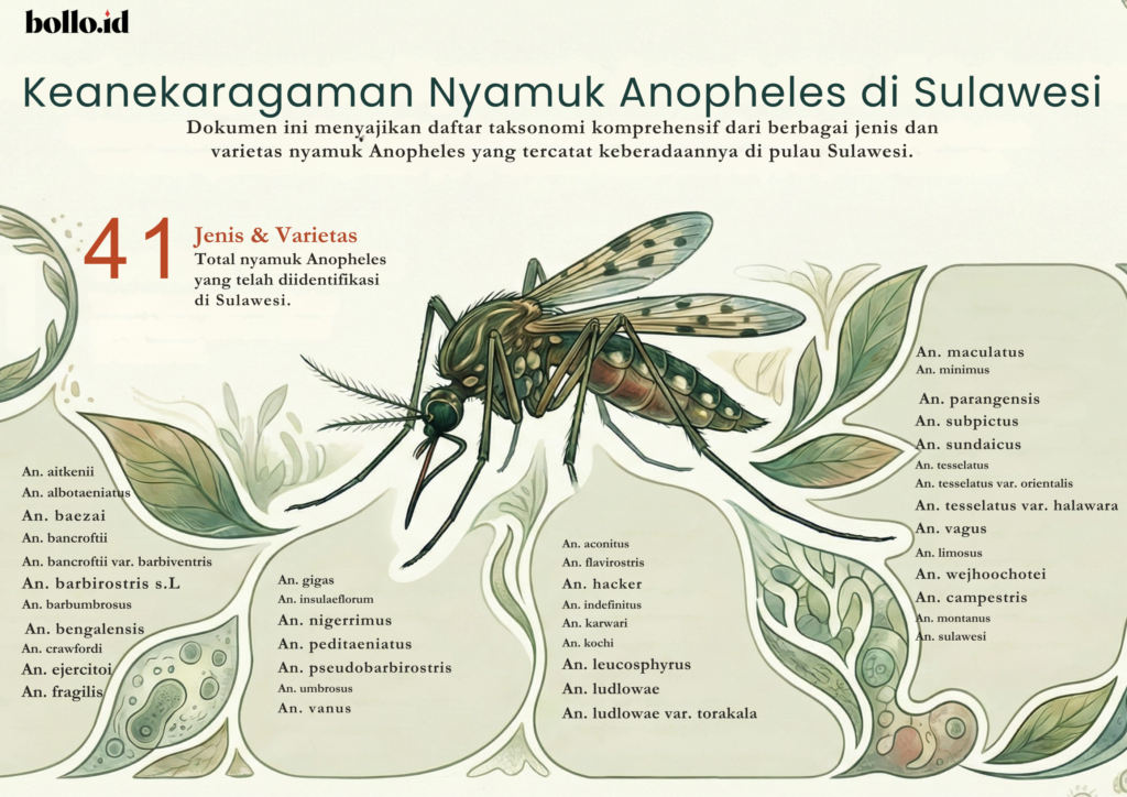 Namun hingga tahun 2019, melalui Subdit Malaria Direktorat Jenderal Pencegahan dan Pengendalian Penyakit (Ditjen P2P) Kementerian Kesehatan, terdapat sebanyak 41 jenis Anopheles yang berada di Pulau Sulawesi.