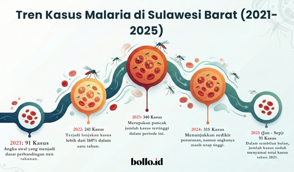 Di Kalimantan Timur, ketika menyaksikan tim survei nyamuk menangkap dan mencari jentik nyamuk Anopheles, mereka dengan begitu telaten memeriksa kubangan yang memiliki lumut. Perubahan lanskap hutan dan lingkungan memengaruhi perkembangan dan serangan nyamuk. Di Sulawesi Barat, setiap tahun kasus malaria selalu terdata. Sepanjang Januari hingga September 2025, jumlah kasus positif di wilayah ini sebanyak 91 kasus.