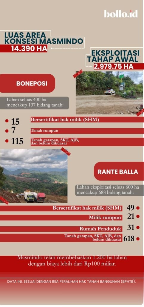 Dan hingga saat ini, Masmindo sudah membebaskan lahan seluas 1.200 ha dengan biaya pergantian melebihi Rp100 miliar. Data ini, sesuai dengan Bea Peralihan Hak Tanah Bangunan (BPHTB).