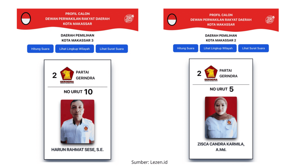 Tangkapan layar rekam jejak Harun dan Zisca dari website informasi pemilihan umum, Lezen.id. Tata letak: Arya Nur Prianugraha untuk Bollo.id.