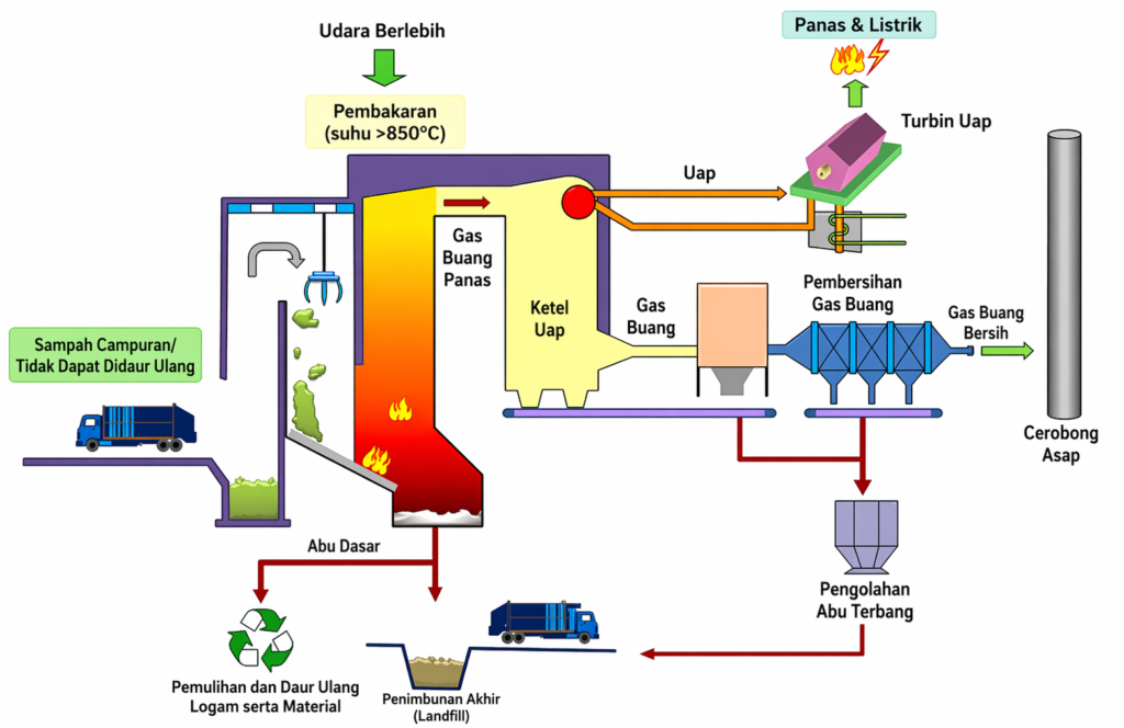 Ilustrasi insinerator PLTSa, menunjukkan proses pengelolaan sampah jadi energi listrik hingga mengeluarkan emisi. Ilustrasi dari Walhi, dibuat ulang menggunakan akal imitasi (AI) untuk Bollo.id.