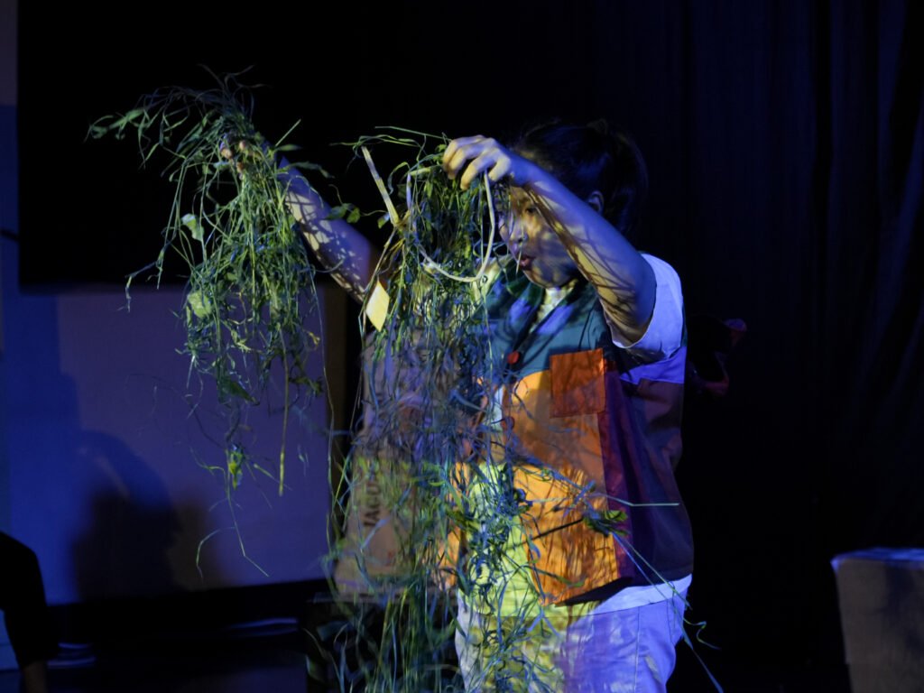 Si Kambing berdiri dengan tatapan ragu, kedua tangannya menggenggam rumput kering yang tampak mencurigakan. Ada ketegangan di wajahnya, seolah menyadari bahwa rumput yang biasa menjadi santapanya itu kini beracun/Foto: Ahmad Amri Aliyyi/Festival Kala Monolog 2025