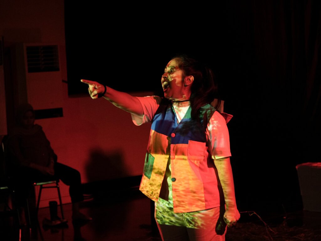 Jaja si ayam tampil dengan ekspresi polos dan ceria. Sambil menunjuk ke arah tertentu, ia seolah sedang menghitung satu per satu pohon yang tumbuh di tanah lapang/Foto: Ahmad Amri Aliyyi/Festival Kala Monolog 2025