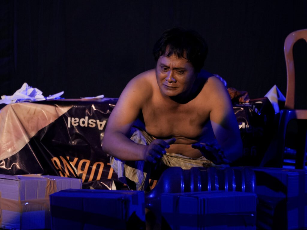 Ekspresi halus, merengkuh, menatap seumpama benda di tengah itu memiliki nama. Narti. Metafor dari benda yang menyerupai pinggul/dada perempuan. Galon/Foto: Ahmad Amri Aliyyi/Festival Kala Monolog 2025