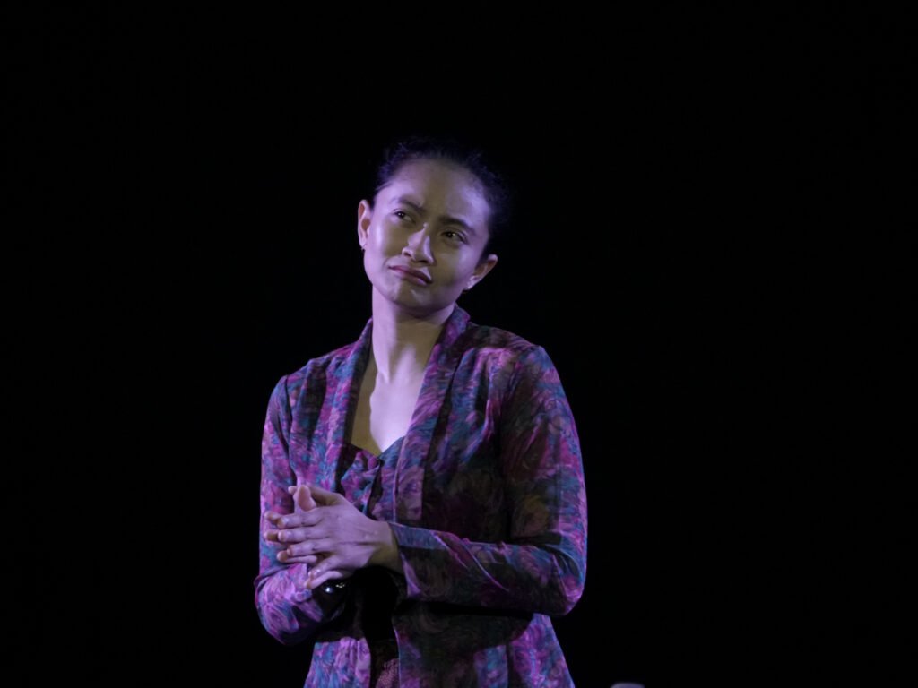 Ibu berdiri dengan tangan terjalin lembut, tatapannya menerawang seperti tengah menakar sesuatu dalam pikirannya. Ekspresi wajahnya tenang penuh pertimbangan, seperti sedang meramu gudek Nanik di wajah dan ingatan/Foto: Ahmad Amri Aliyyi/Festival Kala Monolog 2025